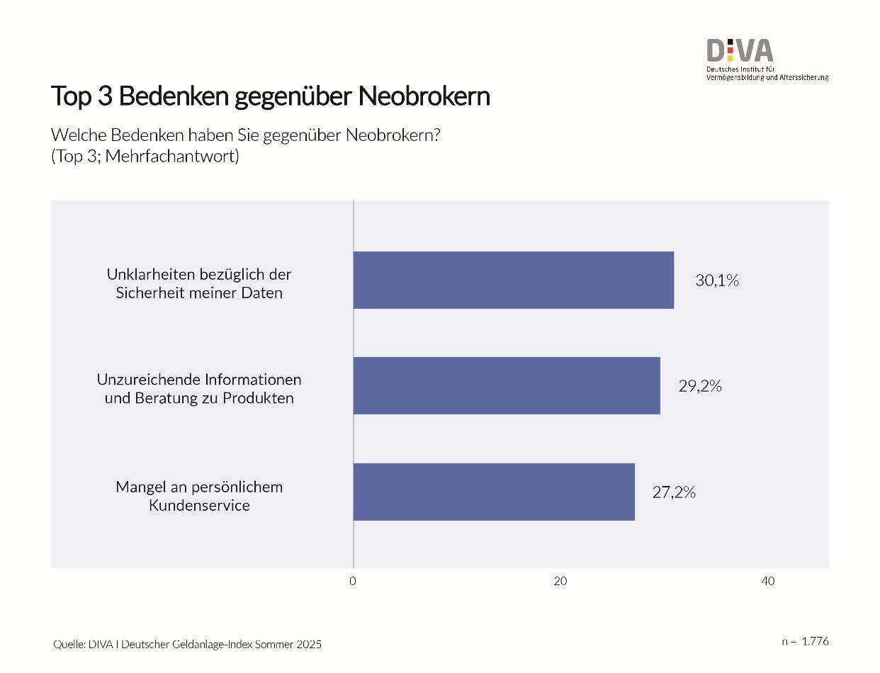 Abb. 2 Achillesfersen der Neobroker: In der aktuellen Geldanlage-Befragung des DIVA monierten die Be-fragten an erster Stelle Unklarheiten bezüglich der Sicherheit der Daten (30,1%), gefolgt von unzureichender Information und Beratung zu Produkten (29,2%) und Mangel an persönlichem Kundenservice (27,2%).