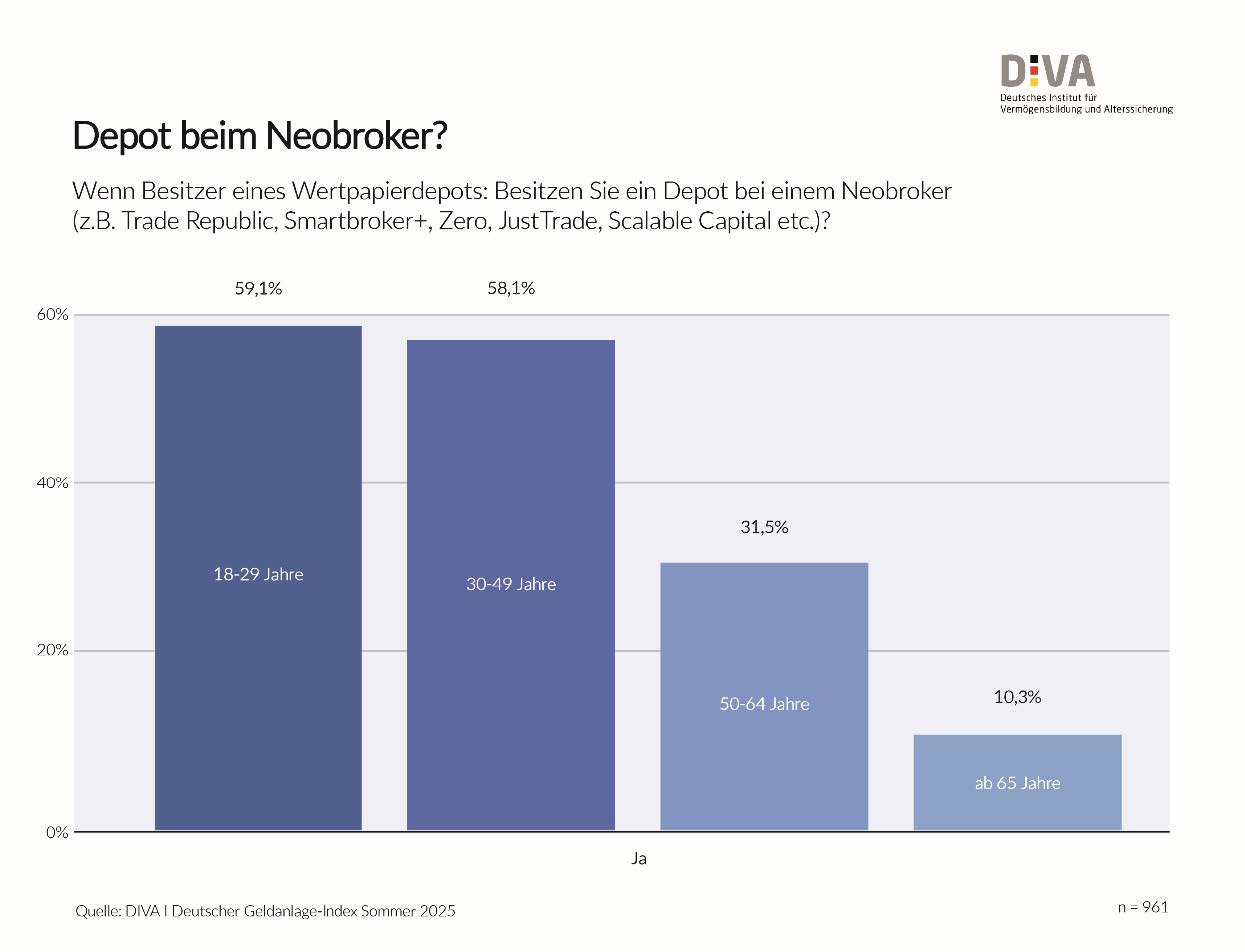 Mehr als die Hälfte der Befragten (51,7 Prozent) gab an, über ein oder auch mehrere Wertpapierdepots zu verfügen, unter diesen 43,0 Prozent (auch) bei einem Neobroker. Besonders hoch ist der Anteil der Neobroker-Nutzer in den Altersgruppen bis 29 Jahre (59,1 Prozent) und bis 49 Jahre (58,1 Prozent). Aber auch unter den über 65-Jährigen sind sie noch mit 10,3 Prozent vertreten. „Neobanken sind erst seit knapp 10 Jahren am Markt. Die Vollbanklizenz erhielt etwa Trade Republic Ende 2023. Angesichts dessen ist die Geschwindigkeit der Marktdurchdringung bemerkenswert. Offensichtlich treffen Ne-obanken den Nerv der Menschen, wenn es um ihre Bankgeschäfte geht“, erläutert Prof. Dr. Michael Heuser, Wissenschaftlicher Direktor des DIVA.