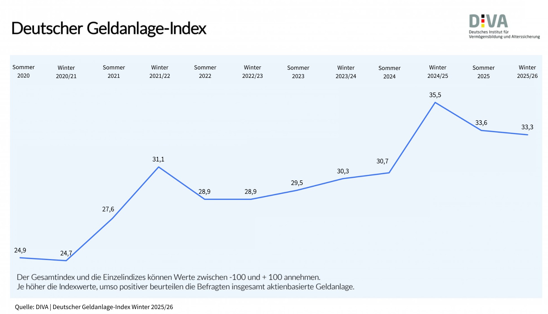 Der Deutsche Geldanlage-Index des DIVA (DIVAX-GA) liegt bei seiner jüngsten Messung im Winter 2025/26 mit 33,3 Punkten weiter auf hohem Niveau und hat sich damit nur minimal zum Wert im Sommer 2025 (33,6 Punkte) geändert. Seit erstmaliger Ermittlung im Sommer 2020 hat sich der Index bis heute von damals 24,9 Punkten um 8,4 Punkte erhöht.