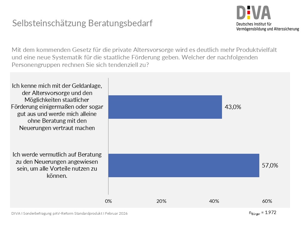 Mit dem kommenden Altersvorsorgereformgesetz soll die staatlich geförderte private Altersvorsorge neu geordnet werden. Mehr Produktvielfalt, eine neue Förderlogik und ein „Standardprodukt“ mit niedrigen Kosten und Online-Abschluss, dies die wichtigsten Eckpunkte. Eine aktuelle repräsentative DIVA-Sonderbefragung unter 2.000 Bürgerinnen und Bürgern macht aber deutlich: Es gibt noch erheblichen Nachbesserungsbedarf.